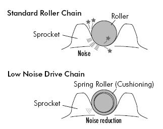 Seria Low Noise - łańcuchy generujące niski poziom hałasu. Unikalna, sprężynowa struktura rolek sprawia że w momencie kontaktu z kołem odkształca się, absorbując siłę uderzenia, redukując tym samym poziom hałasu powstający w skutek uderzenia. W porównaniu ze standardowymi łańcuchami Tsubaki, poziom hałasu jest o 6-8 dB niższy. Temperatura pracy: -10°C to +60°C. Dopuszczalna prędkość pracyL 200 m/min. Standard ANSI.